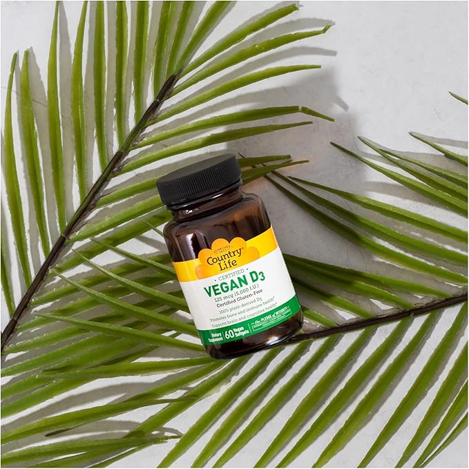 Country Life Vegan D3 5000 IU, 60 Softgels, Certified Gluten Free, Certified Vegan