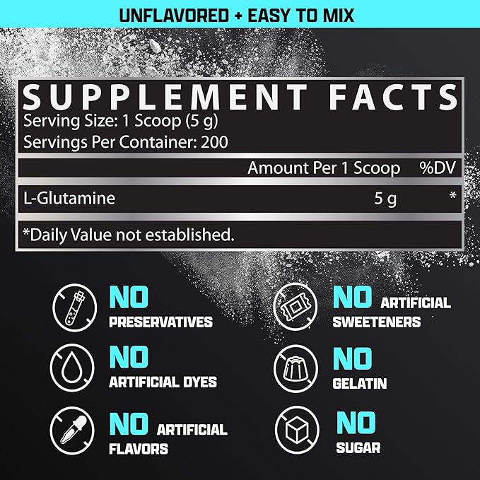 - 5 grams of pure L-glutamine per serving^Reduces muscle breakdown caused by training diet or stress^Enhances muscle recovery and growth^Unflavored so it can be added to any sports drink