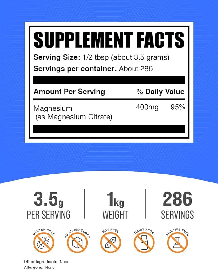 BulkSupplements.com Magnesium Citrate Powder - Magnesium 400mg Supplement, Easily Absorbable - Pure & Gluten Free, 3.5g per Serving, 1kg (2.2 lbs) (Pack of 1)