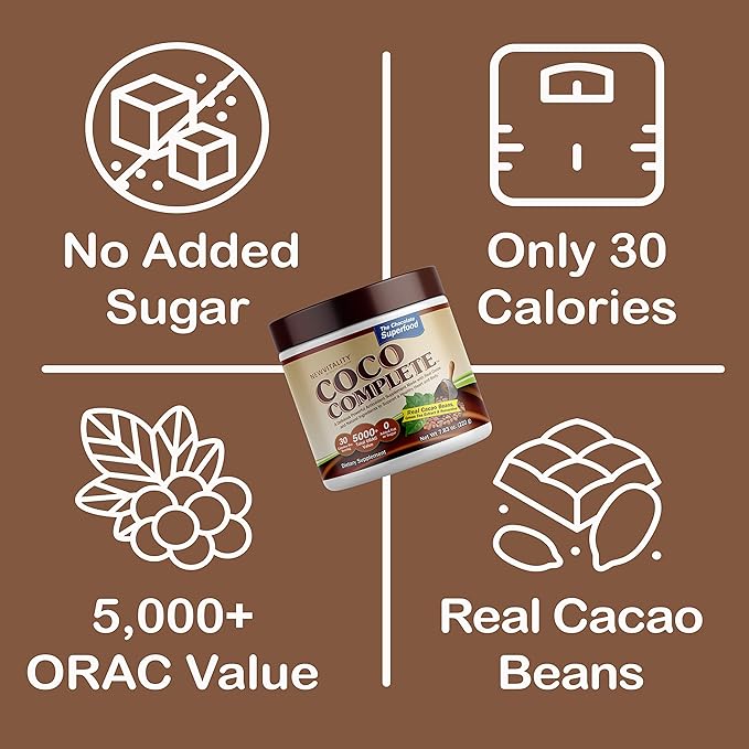 - SUPPORT YOUR HEALTH WITH COCOA: Did you know that pure cacao beans are high in antioxidants? It’s true! But cacao can be extremely bitter, which is why your everyday chocolate bars are loaded with milk, fat, and sugar. Coco Complete is the best of both worlds: you get the incredible antioxidant power you’ve been missing AND that rich chocolate taste you crave!