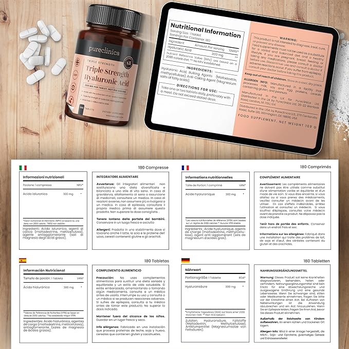 pureclinica Triple Strength Hyaluronic Acid 300mg x 720 Tablets (4 Bottles of 180) - 2 Years Supply