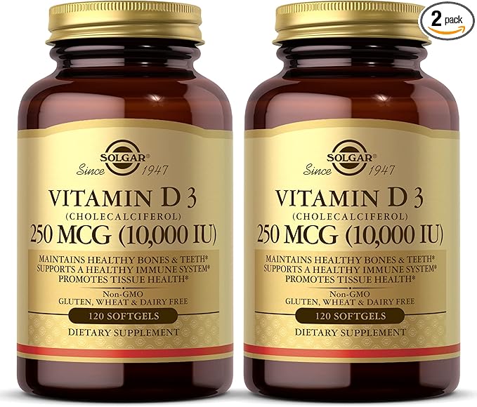 SOLGAR Vitamin D3 (Cholecalciferol) 250 MCG (10,000 IU), 120 Softgels - 2 Pack - Helps Maintain Healthy Bones & Teeth - Immune System Support - Non-GMO, Gluten Free, Dairy Free - 120 Servings