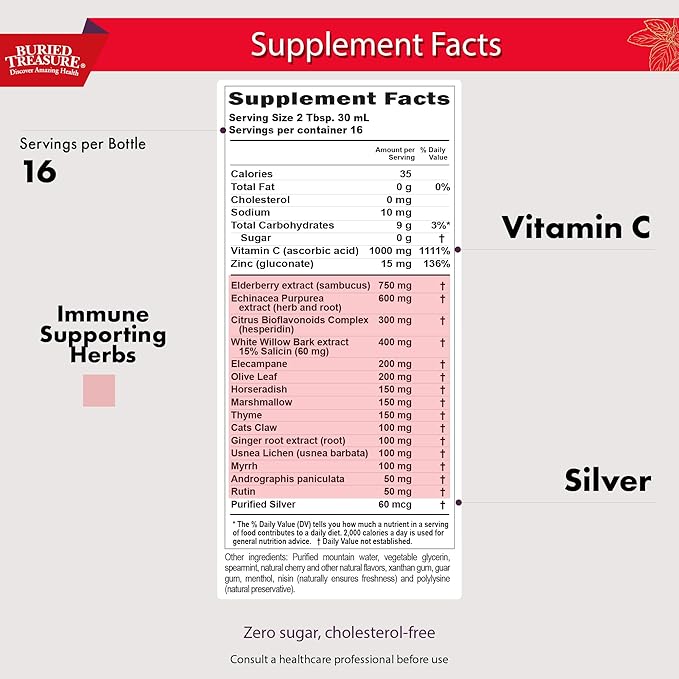 Buried Treasure ACF Extra Strength Immune Support - 16 oz, 16 Servings, Liquid Dietary Immunity Boost w/ Elderberry, Vitamin C & Zinc, Herbal Formula