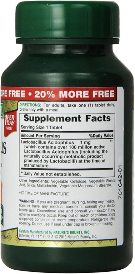 - WITH OVER 100 MILLION ACTIVE LACTOBACILLUS.Nature's Bounty Probiotic Acidophilus contains over 100 million active Lactobacillus Acidophilus (including the naturally occurring metabolic product produced by Lactobacilli) at the time of manufacture.