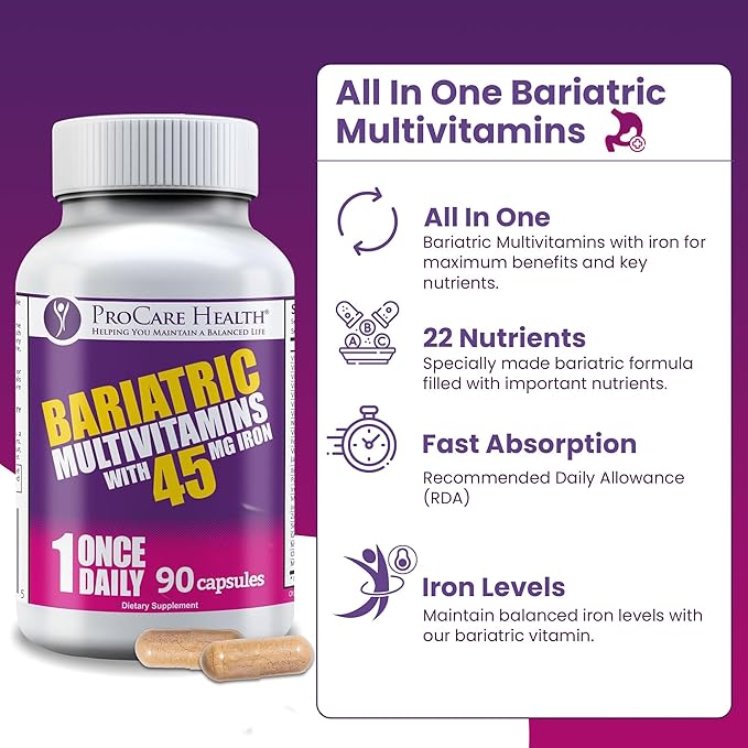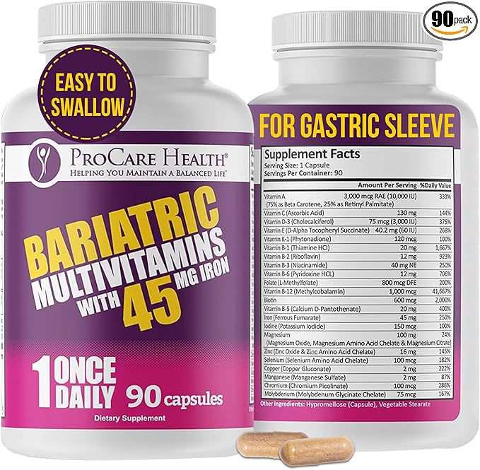 - Budget-Friendly Nutritional Support: Get both health and savings with ProCare Health's bariatric multivitamin. Each bottle offers a three-month supply and gastric vitamins is packed with 45mg of iron, making bariatric must haves an affordable choice without compromising on quality.