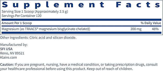 Klaire Labs Magnesium Chelate Powder - Fast-Dissolving 200 Milligrams High Absorption TRAACS Bisglycinate, Vegetarian & Hypoallergenic (120 Servings, 300 Grams)