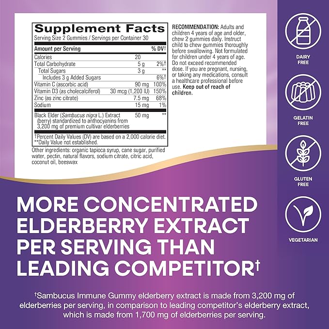- Sambucus Immune Gummies are made with 90 mg of vitamin C, 30 mcg (1,200 IU) of vitamin D3 and 7.5 mg of zinc per 2-gummy serving to support immune health.* Also with highly concentrated, premium black elderberry extract.
