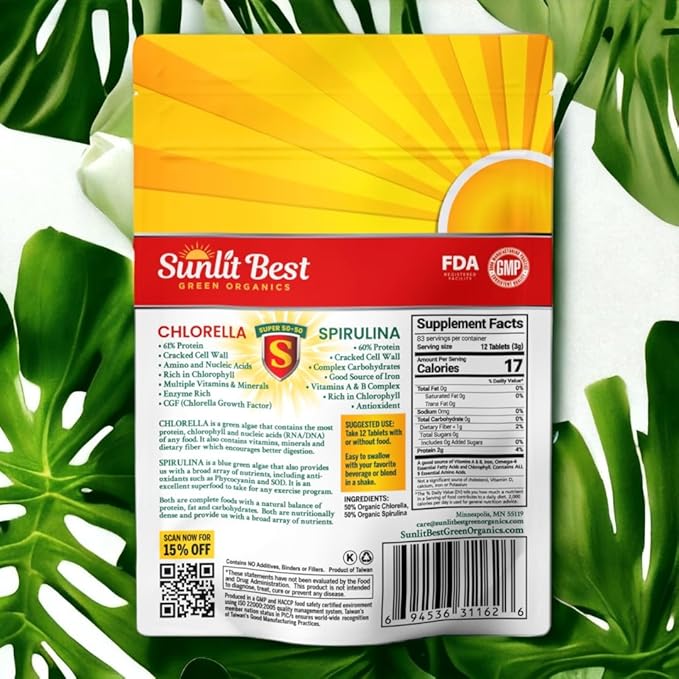 - Removes Toxins & Nourishes Your Body For Optimal Health: Our Organic Chlorella Spirulina Super 50/50 superfood greens supplements (50% Chlorella & 50% Spirulina) nourish your cells to help boost energy levels, support a strong immune system, body toxins removal and cell damage, and help digestion and gut health. Sunlit Best Organic Burst Chlorella Spirulina tablets are an integral part of your natural beauty regime & overall vibrant lifestyle.