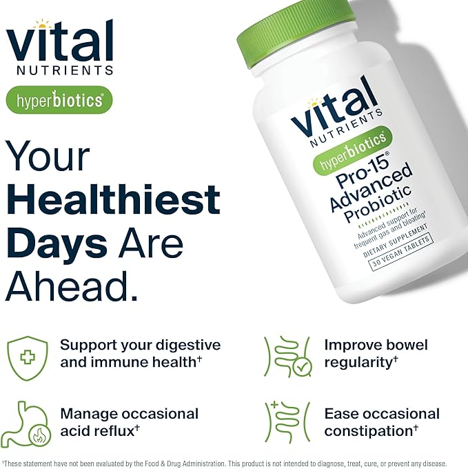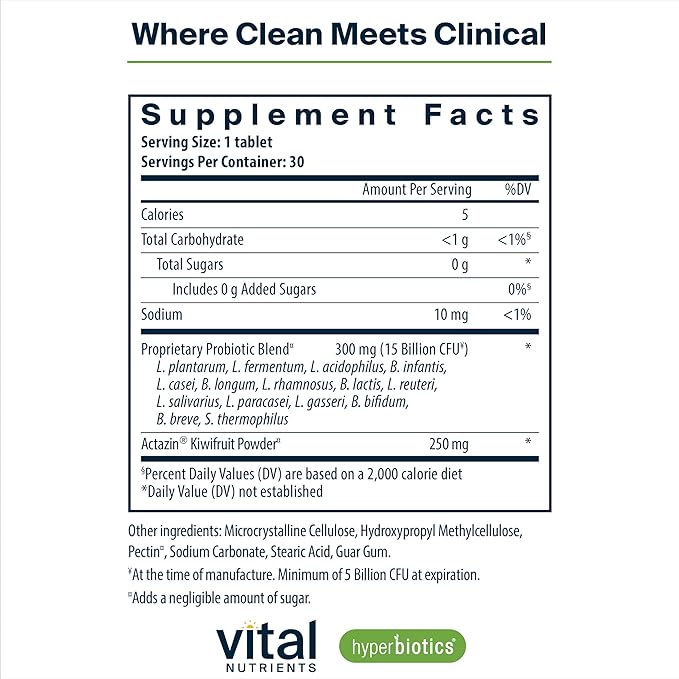 Hyperbiotics Vital Nutrients Pro-15 Advanced Probiotics for Women and Men | 15 Strains + Kiwifruit | Clinically Studied Daily Probiotics for Digestive Health, Gas, & Bloating | 30 Vegan Tablets