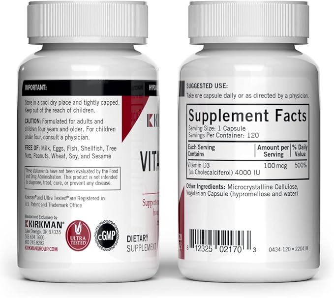 Kirkman - Vitamin D3 4000 IU - 120 Capsules - Supports Immune Health - Helps Build Strong Bones - Hypoallergenic