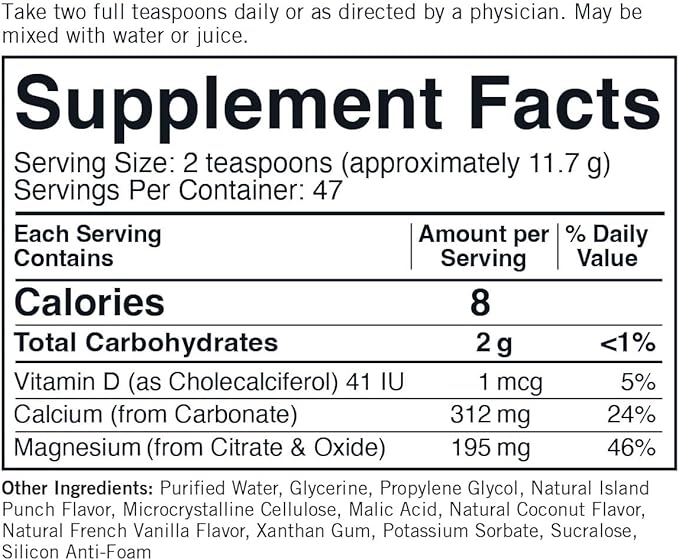 - This is a calcium and magnesium liquid supplement with vitamin D3. Flavored with natural island fruit punch, natural coconut and natural french vanilla.