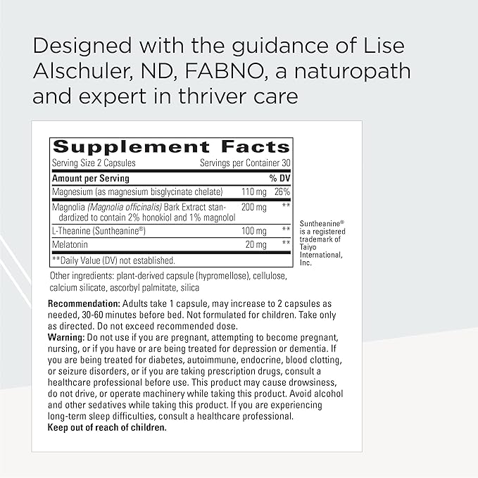 - Supplement with L-Theanine & Melatonin: This supplement with magnolia bark extract and magnesium bisglycinate was designed with the guidance of Lise Alschuler, ND, FABNO, a naturopath and expert in thriver care