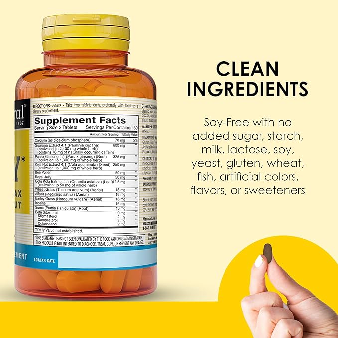 MASON NATURAL Super Energy with Guarana, Panax Ginseng & Kola Nut - Herbal Complex Formula to Support Optimal Performance & Energy*, 60 Tablets