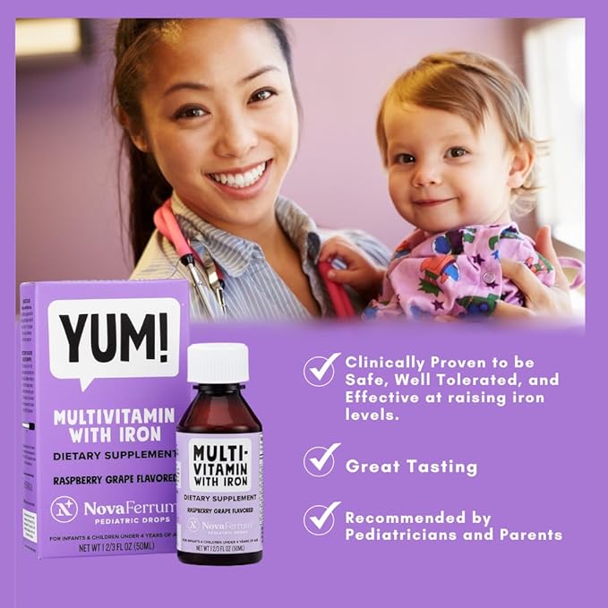 NovaFerrum Yum | Multivitamin with Iron for Infants, Toddlers & Kids | Immune Support | Ages 4 & Under | Gluten Free Certified | Sugar Free | Raspberry Grape | 50 Servings