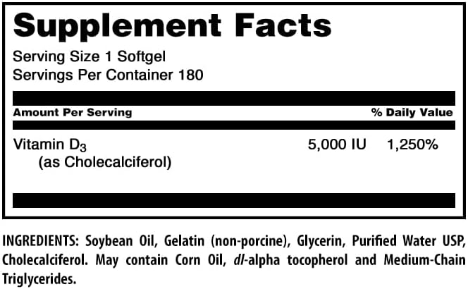 - Vitamin D3 Cholecalciferol 5000 IU Per Serving Supplement