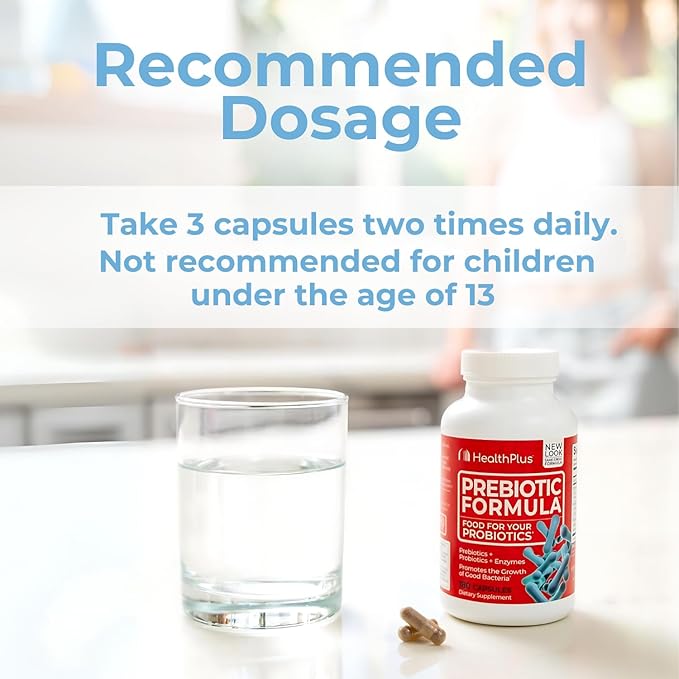 Health Plus Prebiotic Formula - Probiotics + Prebiotics + Digestive Enzymes - Gluten Free, Dairy Free, Natural Herbal Ingredients (180 Capsules, 60 Servings)