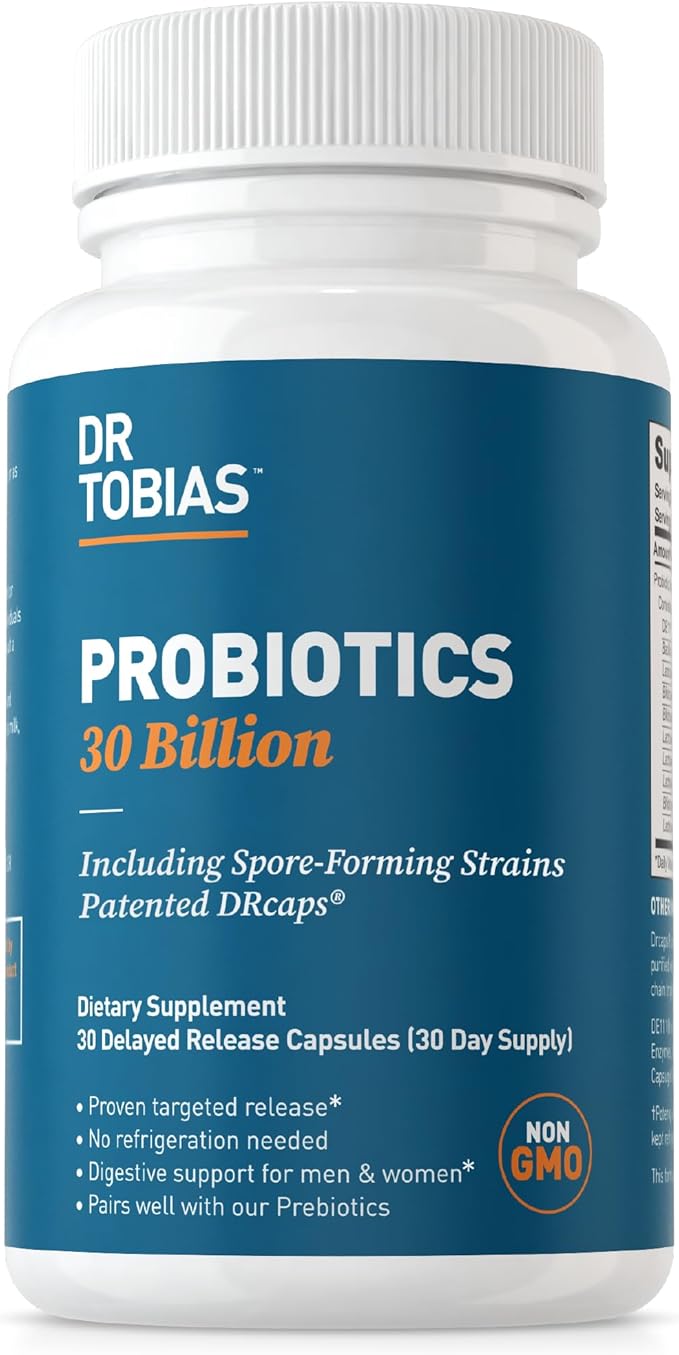 Dr. Tobias Probiotics 30 Billion, 10 Strains, 30 Billion CFU's, Targeted Release Probiotics for Women & Men, Supports Digestive Health, Shelf-Stable, Non-GMO, 30 Capsules, 30 Servings