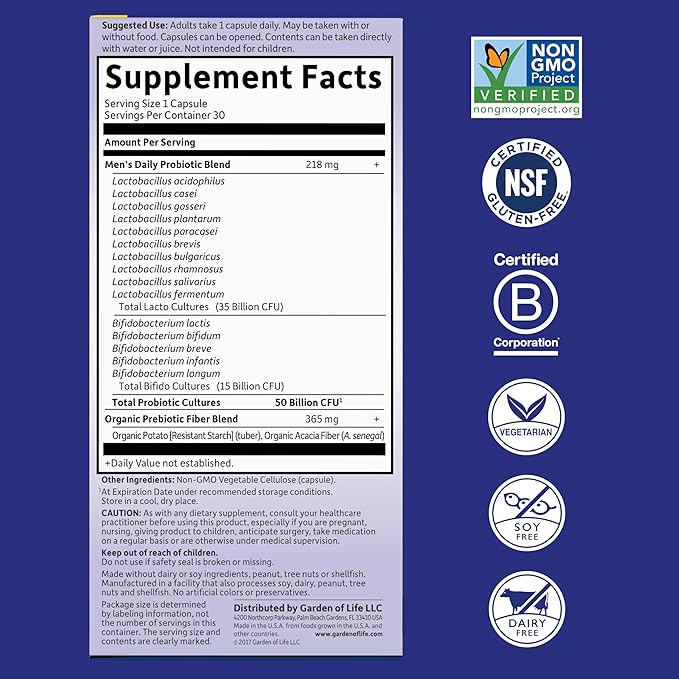 Garden of Life Probiotics for Men Dr Formulated 50 Billion CFU 15 Probiotics for Digestive Health + Organic Prebiotic Fiber for Colon & Immune Support, Daily Gas Relief, Shelf Stable, 30 Capsules