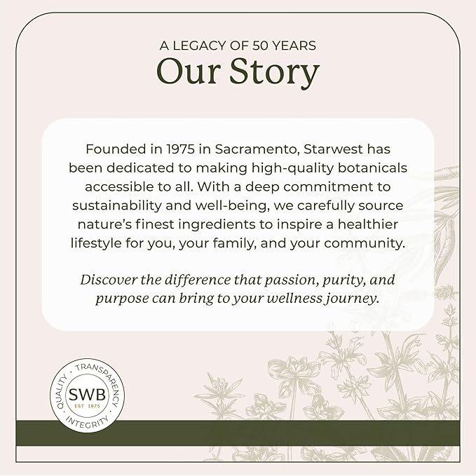 - STARWEST SUSTAINABILITY: With a commitment to responsible sourcing, Starwest Botanicals works with expert farmers across over 50 countries to provide carefully cultivated herbs, spices, and teas