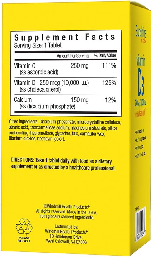 - ENJOY SUNSHINE THE EASY WAY – Each bottle of Sunshine Super Vitamin D contains 60 single serve tablets. Each contains 10,000 IU (250 mcg) of vitamin D and 150 mg of calcium and 250 mg of vitamin C.