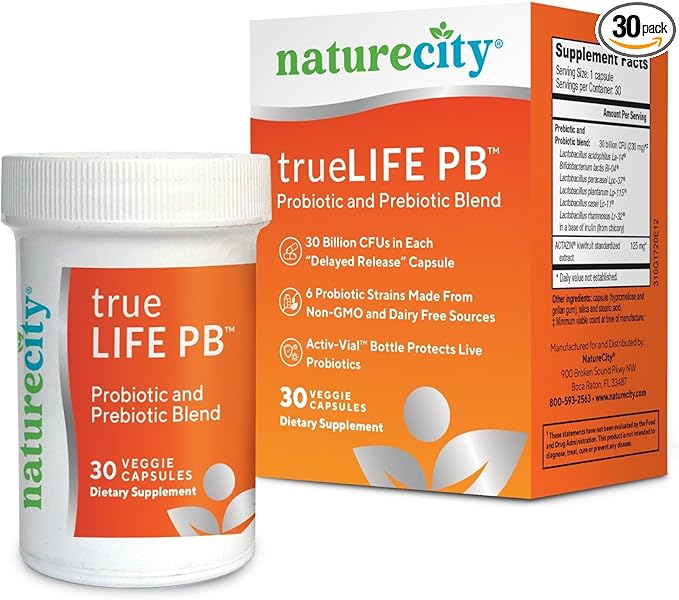 NatureCity True-Life-PB Shelf Stable Blend Prebiotics and Probiotics for Women and Men - Digestive Gut Health Supplements for Women and Men - Dairy Free - (30 Veggie Capsules)