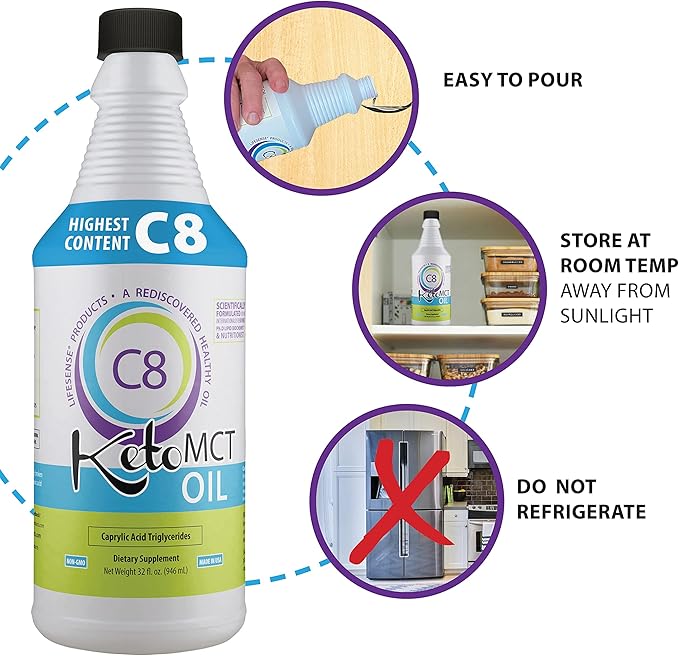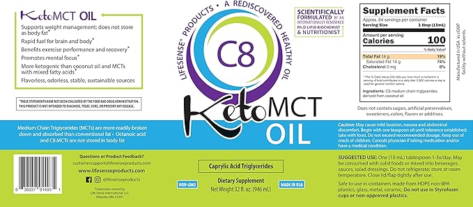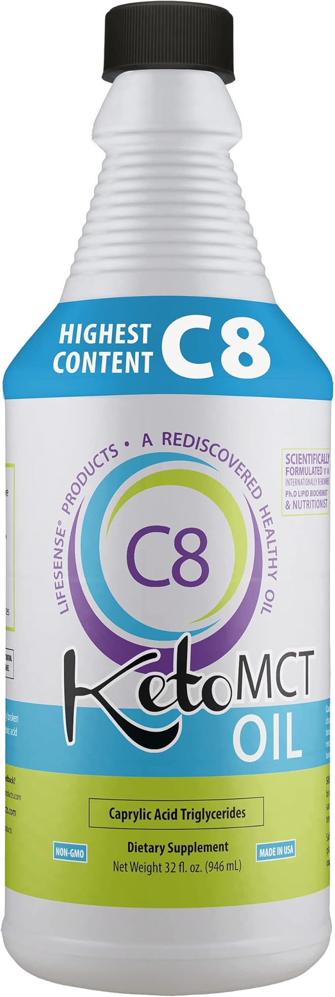 LIFESENSE C8 MCT Oil, Keto-Friendly, Sourced from Coconut Oil, Clinically Proven to Increase Ketone Production, Optimal Fuel for The Brain and Body, Made in USA by PhD Nutrition, 32 oz