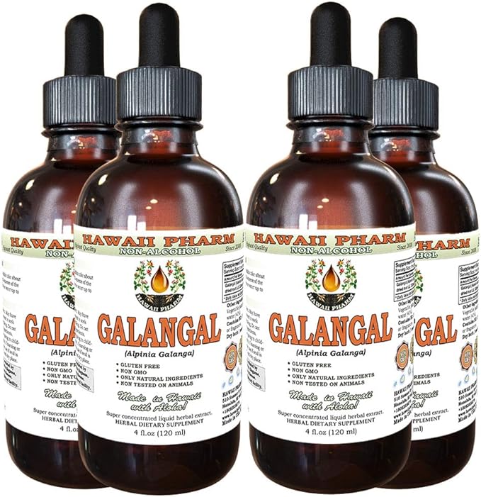 Galangal Root Alcohol-Free Liquid Extract, Organic Organic Galangal (Alpinia Galangal) Dried Root Glycerite Hawaii Pharm Natural Herbal Supplement 4x4 oz