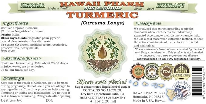 Hawaii Pharm Turmeric Alcohol-Free Liquid Extract, Organic Turmeric (Curcuma Longa) Dried Rhizome Glycerite Natural Herbal Supplement, USA 4 fl.oz