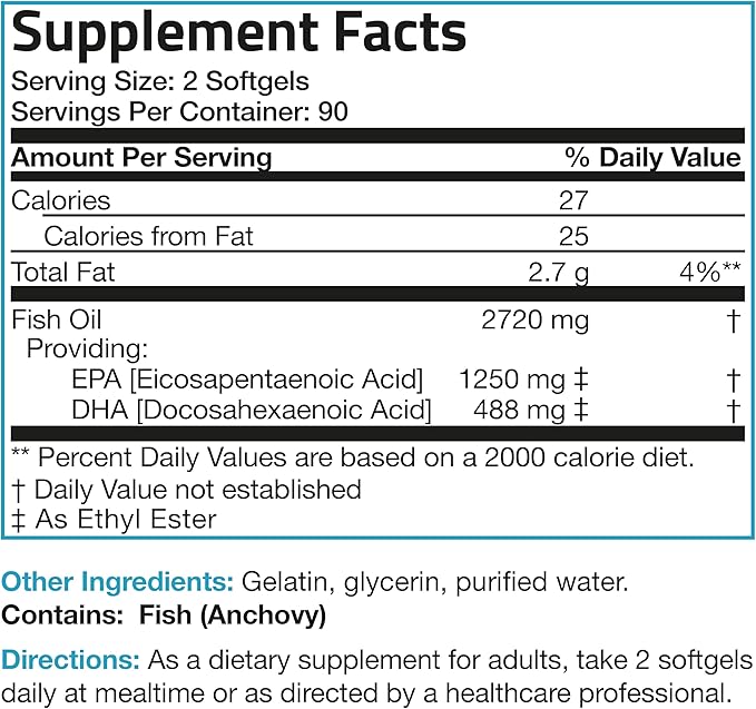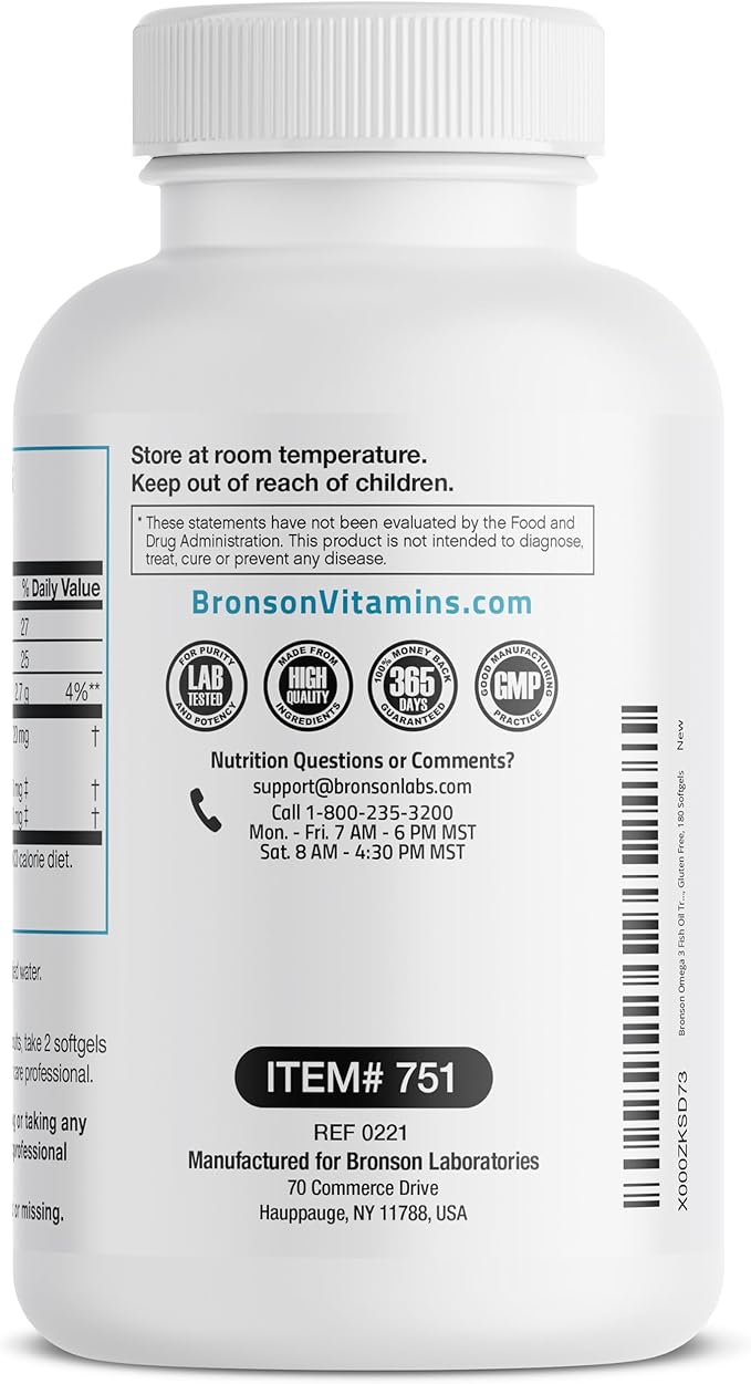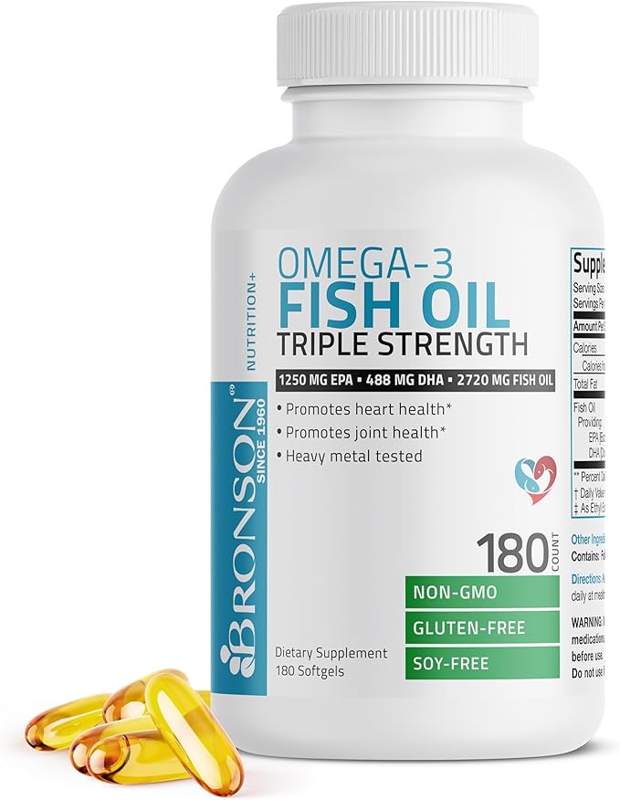 Bronson Omega 3 Fish Oil Triple Strength 2720 mg, High EPA 1250 mg DHA 488 mg, Non-GMO Heavy Metal Tested, 180 Softgels