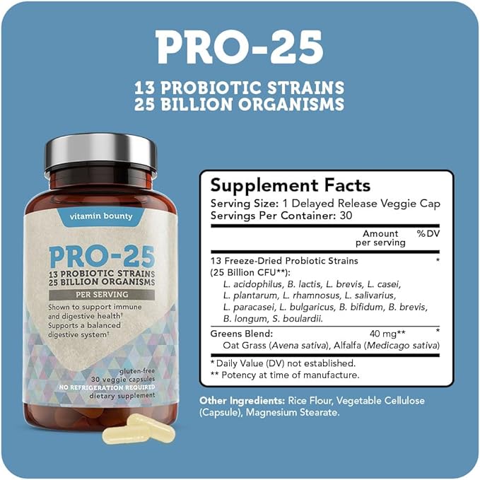 Vitamin Bounty Pro 25 Probiotic with Prebiotics for Oral & Dental Health, Gut and Digestive Support - 13 Strains, 25 Billion CFU, Embocaps & Fermented Greens, 30 Count (Pack of 1)