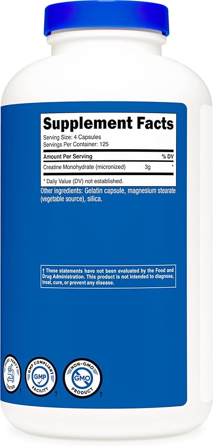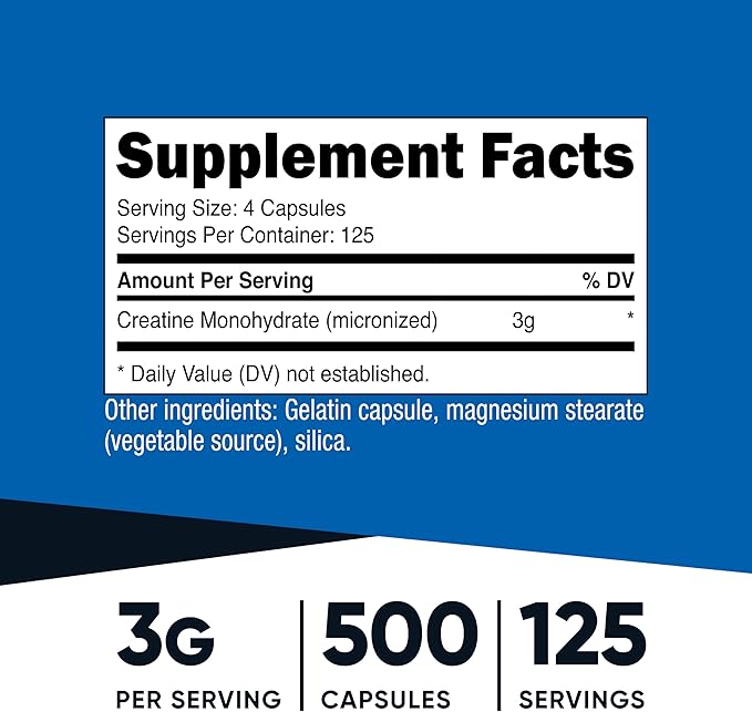 - 500 Capsules (125 Servings) of Creatine Monohydrate Per Bottle