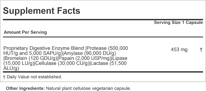 - Superior pure bio-active ingredients - Provides natural digestive enzyme blend including Protease, Amylase, Bromelain, Papain, Lipase, Cellulase and Lactase. Contains no Milk/ Dairy-Free, Gluten Free; no soy, yeast, wheat, sodium, salt, sugar, fat, cholesterol, color, preservative, common allergens or manufacturing additives.