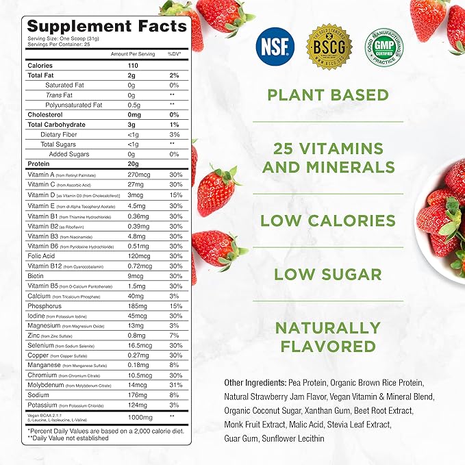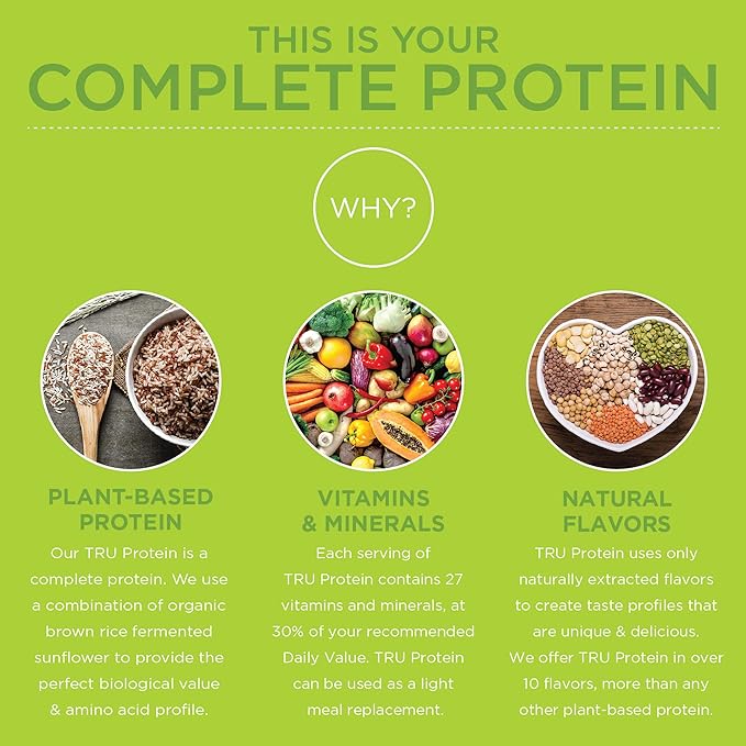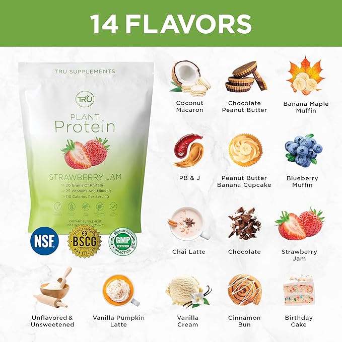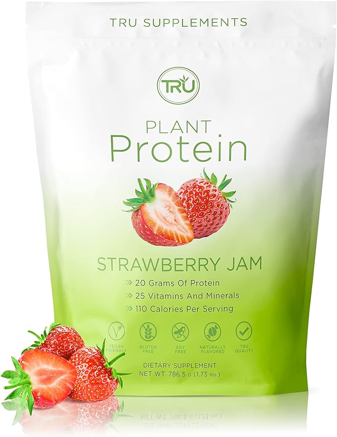 TRU Supplements Plant Based Protein Powder, BCAA, EAA, 20g Vegan Brown Rice & Pea Protein, 100 Calories, 27 Vitamins, No Artificial Flavors 25 Servings (Strawberry Jam)