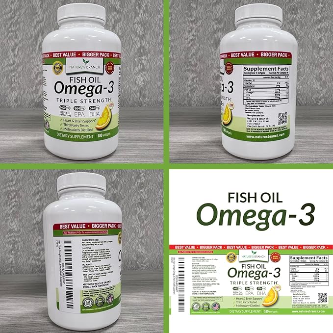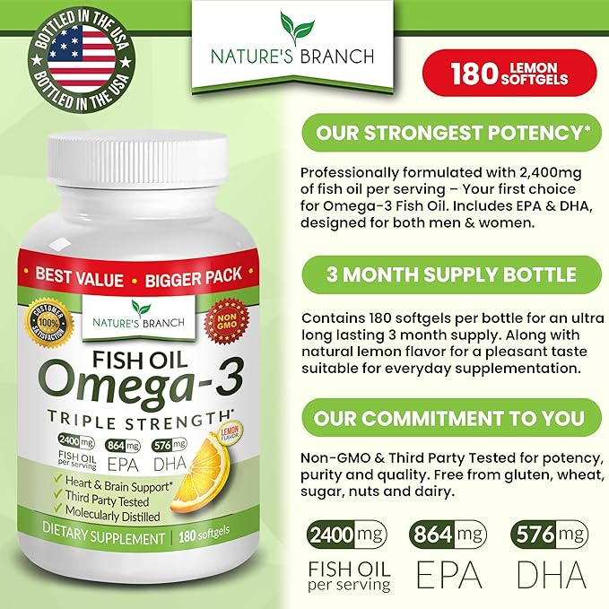 - 3 MONTH SUPPLY (180 SOFTGELS) PREMIUM OMEGA 3 FISH OIL PILLS: Our highest concentrate, 2400mg triple strength, molecularly distilled premium Omega 3 softgels delivering essential fatty acids in every serving with 180 lemon flavor, burpless capsules in every bottle