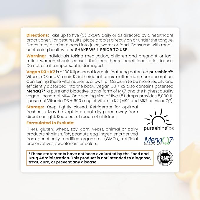 - πππ% πππππππππ π ππππππ: Our practitioner-recommended Vitamin D3 & Vitamin K2 formula utilizes 100% liposomal nutrients! We utilize liposomal liquid Vitamin D3 & K2 for maximum absorption. Multiple scientific studied have proven that liposomal nutrients aborb faster and more eficiently, and are better utilized by your body. Purity is prority.