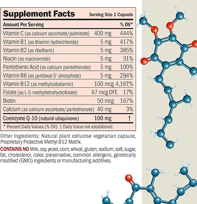 - Superior pure bio-active ingredients - Provides the finest, natural source of CoQ10, world’s most sophisticated high potency B-complex formula, including our absorption-protected Natural B12, vitamin C and Calcium. Contains no Milk / Dairy-Free, Gluten Free; no soy, yeast, corn, wheat, sodium, salt, sugar, fat, cholesterol, color, preservative, common allergens or manufacturing additives.