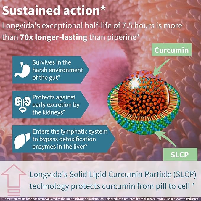 - SUSTAINED ACTION: due to its protective nature, Longvida curcumin achieves peak active plasma levels with a 7hr half-life, even with much lower doses than competing delivery systems. In comparison, piperine extends half-life by only a few minutes*
