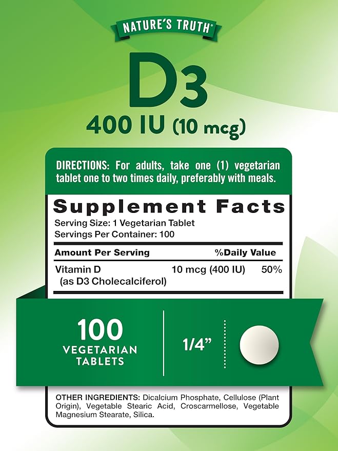 Nature's Truth Vitamin D3 | 400 iu (10 mcg) | 100 Tablets | Vegetarian, Non-GMO, & Gluten Free Supplement