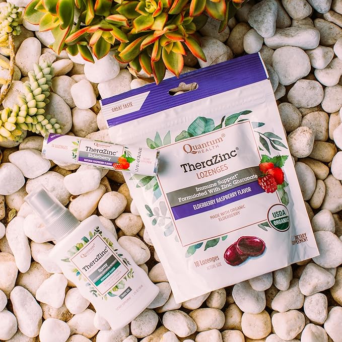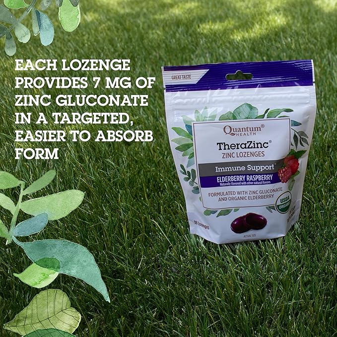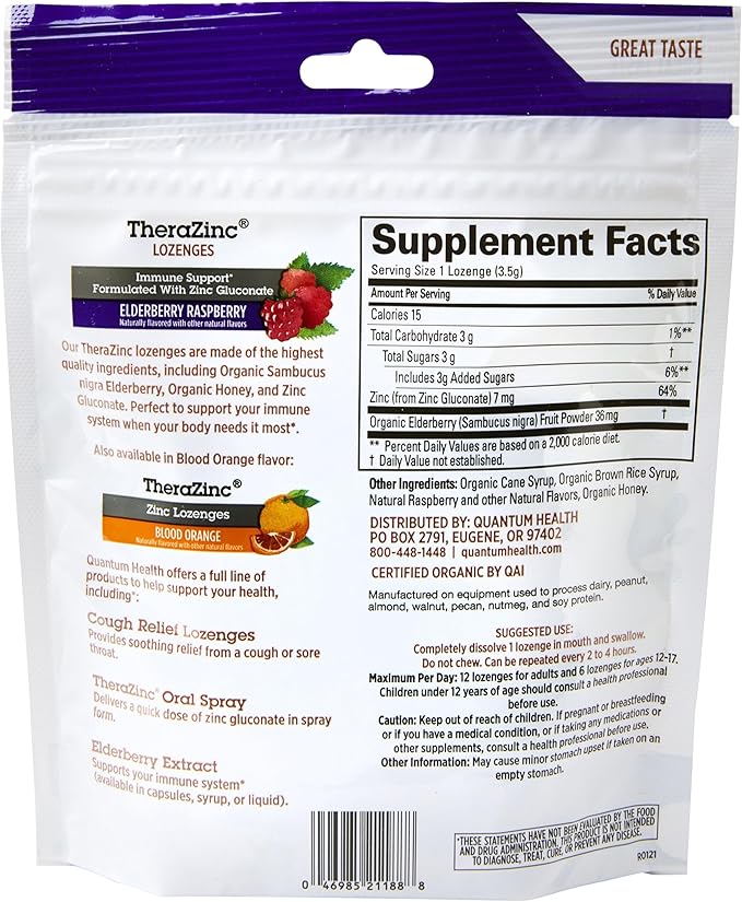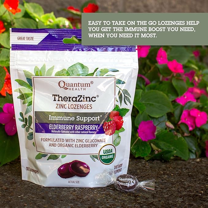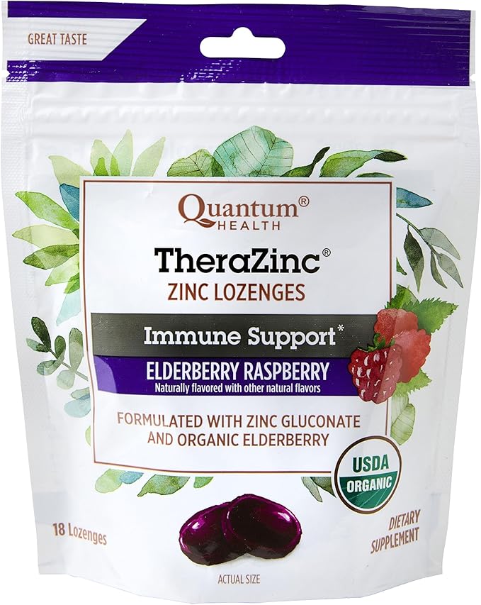 Quantum Health TheraZinc Organic Zinc Lozenges Elderberry Sambucus Raspberry & Honey Immune Support for Adults & Kids 12+ Naturally Flavored Fast Relief with No Aftertaste -18 Count (Package may vary)