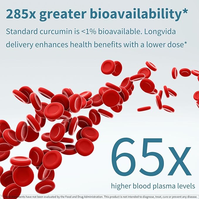 - ULTRA BIOAVAILABLE: standard curcumin is poorly bioavailable. Longvida ensures 285x greater bioavailability and delivers 65x higher blood plasma levels, supporting the movement of ‘free’ curcumin from the bloodstream to target tissues*