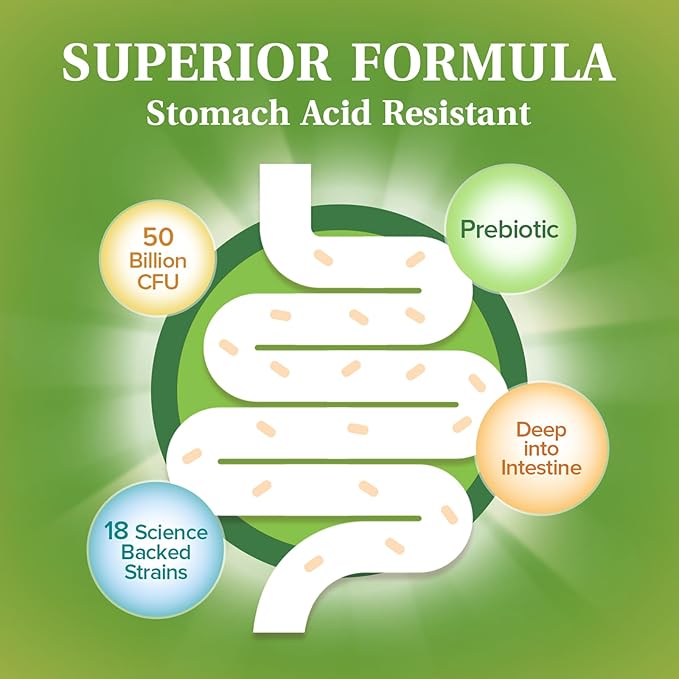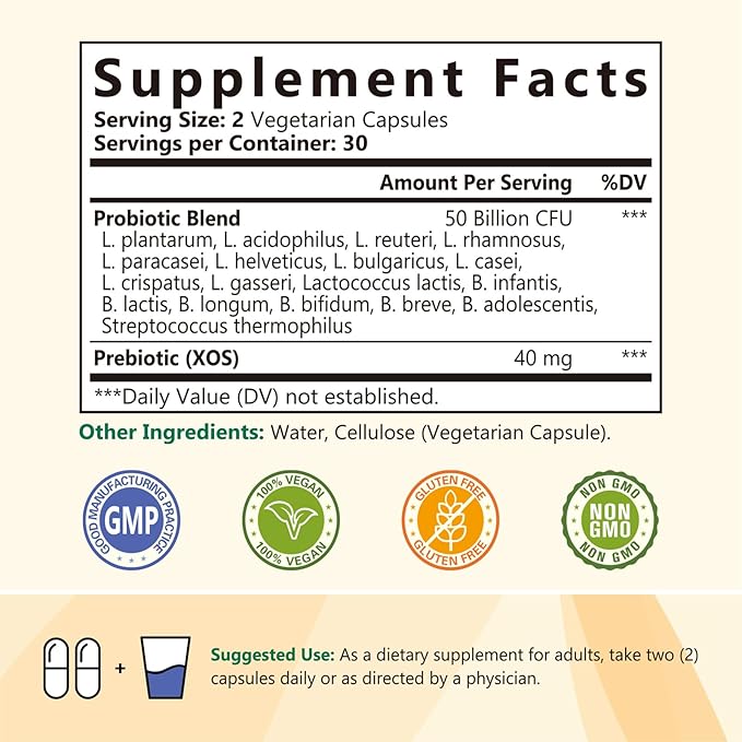 Probiotics 50 Billion per Serving, 18 Probiotic Strains, 60 Veggie Capsules - Non-GMO, Gluten Free