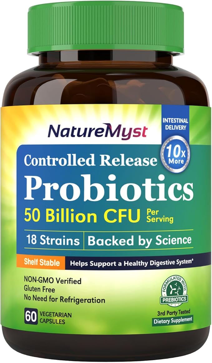 - [Formulated with Prebiotics for your Digestive Health] NatureMyst Probiotics are formulated with Prebiotics Fiber which aids the maintenance of probiotic activity. Our doctor formulated products will naturally increases levels of beneficial bacteria and rebalance your gut flora, and relieve occasional diarrhea, constipation, and other digestive issues.*