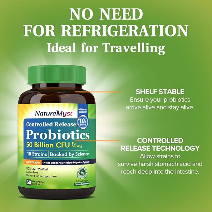- [50 Billion CFUs 18 Science Backed Strains Formula] Each NatureMyst Probiotics serving delivers 50 Billion beneficial bacteria to your gut. Our probiotics has been carefully designed to be stable at room temperature. It is easy to store and great for travel. No Need for Refrigeration.