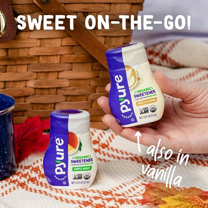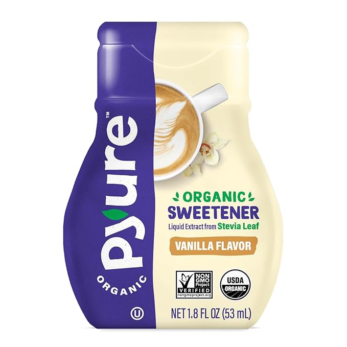 - 🏆 PYURE ORGANIC VANILLA STEVIA LIQUID SWEETENER (1 BOTTLE OF 1.8 FL OZ) : Pyure Liquid Stevia Extract is our most convenient sugar substitute, highly concentrated for on-the-go use. Super sweet with no bitterness or aftertaste. 100 servings per container. Gently squeeze bottle for a steady stream.