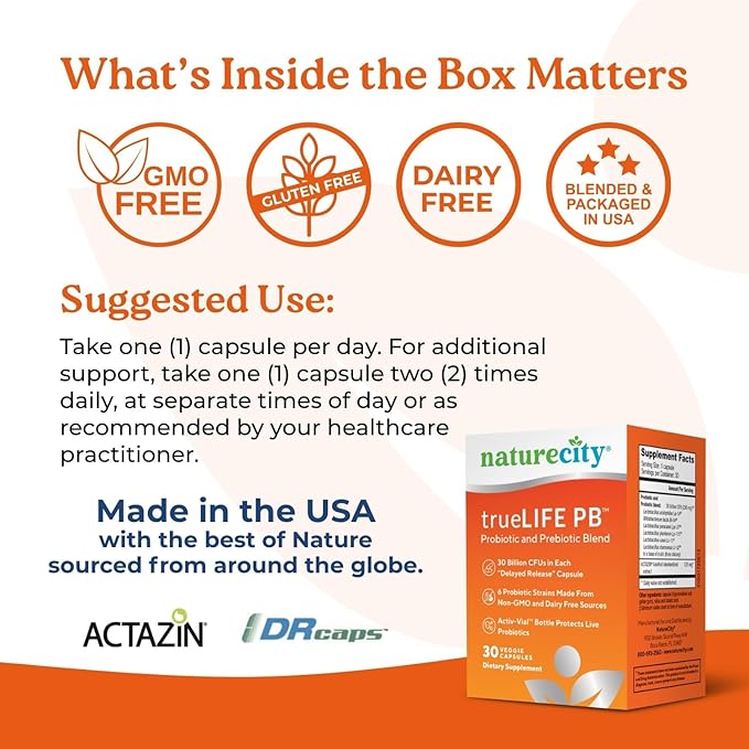 NatureCity True-Life-PB Shelf Stable Blend Prebiotics and Probiotics for Women and Men - Digestive Gut Health Supplements for Women and Men - Dairy Free - (60 Veggie Capsules)
