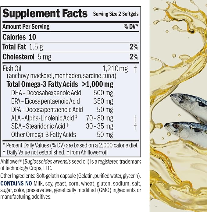 - Superior pure bio-active ingredients - Highly concentrated, ultra-pure fish oil provides Omega-3’s including DHA-Docosahexaenoic Acid, EPA-Eicosapentaenoic Acid and DPA-Docosapentaenoic Acid, along with plant-based Omega-3 fatty acids from Ahiflower Oil. Contains no Milk / Dairy-Free, Gluten Free; no soy, yeast, corn, wheat, sodium, salt, sugar, starch, emulsifier, wax, binder, filler, excipient, lubricant, coating, diluent, flowing agent, color, sweetener or preservative.