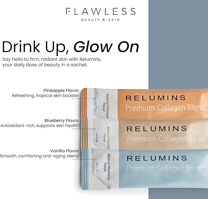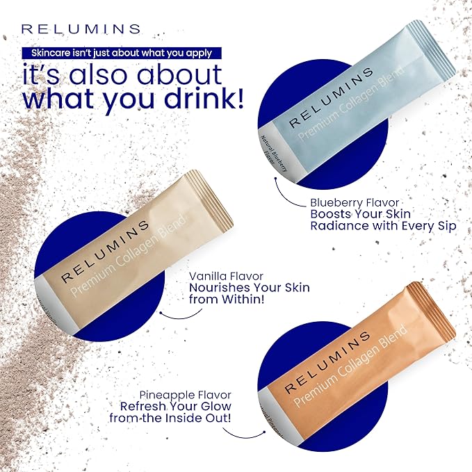 - RELUMINS ADVANCE WHITE COLLAGEN BLEND -Premium Marine-Derived Collagen Restores Youthful Skin Tone, Fights Cellulite and Premature Aging<br/> - 1000mg of L-Glutathione Complex (Reduced L-Glutathione, Alpha Lipoic Acid, Rose Hips)<br/> - Contains Glucosamine & Hyaluronic Acid to Stimulate Connective Tissue Repair<br/> - Natural Fruit Juices Give a Delicious Flavor to this Otherwise Tasteless Collagen - Tastes Great Without Bad Aftertaste!<br/> - 10 Sachets