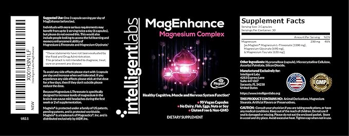 Intelligent Labs MagEnhance Magtein Magnesium Complex Supplement L-Threonate with Magnesium Glycinate and Taurate, 90 Capsules