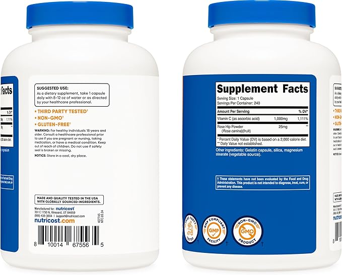 Nutricost Vitamin C with Rose HIPS 1025mg, 240 Capsules - Vitamin C 1,000mg, Rose HIPS 25mg, Premium, Non-GMO, Gluten Free Supplement