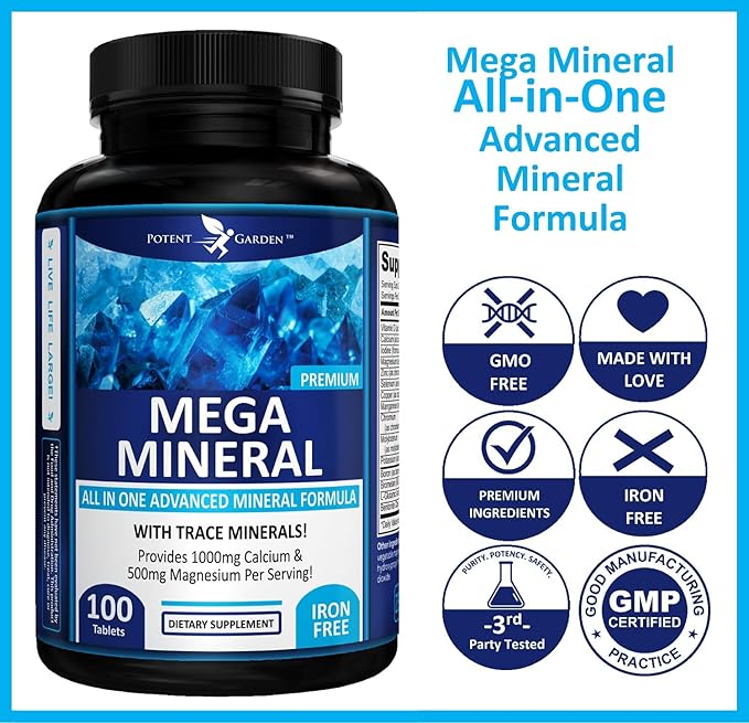 Potent Garden Mega Mineral Supplement Complete Mineral Complex with Calcium Magnesium Zinc Potassium Boron Selenium Chromium & 72 Trace Minerals Iron Free Calcium Supplement -100 Pills